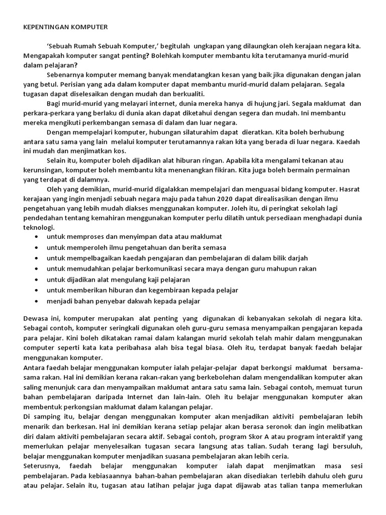 Oleh ituKomputer juga ialah bahan yang digunakan oleh pelbagai pihak bagi mendapatkan maklumat dalam pelbagai masalah yang berlaku kepada negara-negara yang bermasalahseperti berlaku becana yang melanda negara itu dengan akan membawa maut kepada semua manusia kepada muka bumikomputer adalah bahan terpenting dalam. Terdapat banyak kepentingan komputer kepada murid. Keluarga yang amat sangat sederhana terdiri atas Abah kepala keluarga yang bekerja sebagai penarik becak dan buruh apa saja.